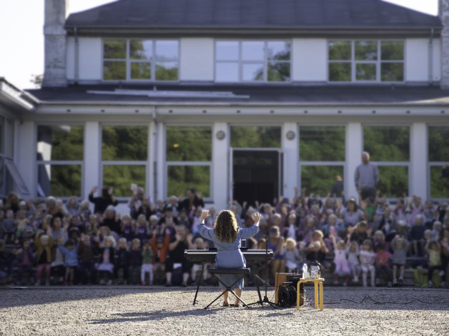 Kom og vær med til en festlig og musikalsk formiddag med udendørs fællessang for børn i alderen 0-6 år på plænen ved biblioteket. Line Ekman fra Ringsted Musik- og Kulturskole spiller på keyboard og byder op til sang og dans for børnene.